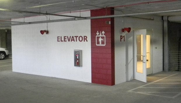 A once bare gray building after paint and lettering. This parking lot is in the basement of a hotel in downtown Knoxville Tennessee.